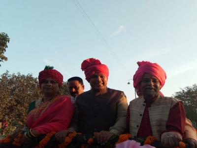 91व्या मराठी साहित्य संमेलनाच्यानिमित्ताने ऐतिहासिक पार्श्वभूमी लाभलेल्या बडोद्यामधील वातावरण मराठीमय झाले आहे. ग्रंथदिंडीमध्ये सहभागी झालेले मावळते संमेलनाध्यक्ष अक्षयकुमार काळे. ( सर्व छायाचित्रे - स्नेहा मोरे)