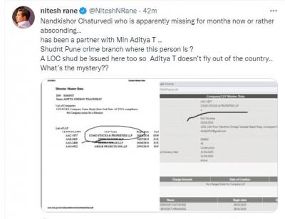 पण त्याचसोबत नितेश राणे यांनी थेट ठाकरे कुटुंबातील मंत्री आदित्य ठाकरे(Aditya Thackeray) यांनाही लुकआऊट नोटीस जारी करण्याची मागणी केली. नितेश राणेंनी ट्विटमध्ये आदित्य ठाकरेंचे पार्टनर असलेले नंदकिशोर चतुर्वेदी गेल्या काही महिन्यांपासून बेपत्ता किंवा फरार आहेत. ही व्यक्ती कुठे आहे? पुणे गुन्हे शाखेने आदित्य ठाकरेंनाही लुकआऊट नोटीस जारी करावी जेणेकरून ते देश सोडणार नाहीत असं म्हटलं आहे. त्यामुळे राणे आणि शिवसेना हा संघर्ष येत्या काळात आणखी चिघळण्याची शक्यता आहे.