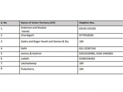 केंद्र शासित प्रदेशांसाठी हेल्पलाईन नंबर