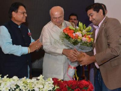 माजी मुख्यमंत्री सुशीलकुमार शिंदे यांचे स्वागत करताना करण दर्डा