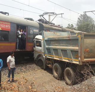 ऑनलाइन लोकमत ठाणे, दि. १६ - हार्बर रेल्वे मार्गावर एक डंपर पनवेल-ठाणे लोकल ट्रेनला धडकला आहे. खांदेश्वर रेल्वे स्थानकाजवळ हा अपघात झाला आहे. दुपारी एकवाजण्याच्या सुमारास हा अपघात झाला. अपघातानंतर डंपरचालक डंपर तिथेच सोडून पसार झाला. या अपघातात कोणतीही जिवीतहानी झालेली नाही. घटनास्थळी रेल्वे पोलिस दाखल झाले असून, डंपरला तिथून हटवण्याचे काम सुरु आहे. डंपर हटवल्याशिवाय रेल्वे वाहतूक पूर्ववत होऊ शकणार नाही.प्रत्यक्षदर्शींनी दिलेल्या माहितीनुसार ही धडक जोरदार होती. यामध्ये ट्रेनच्या काही भागाचे आणि डंपरचेही नुकसान झाले आहे. या अपघातामुळे हार्बर रेल्वे मार्गावरील वाहतूक विस्कळीत झाली आहे.