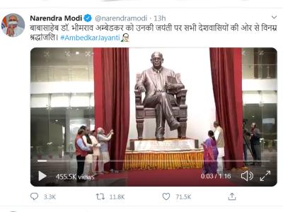 पंतप्रधान नरेंद्र मोदी यांनी एक व्हिडीओ ट्विट करून बाबासाहेबांना अभिवादन केलं. तसंच, देशाला संबोधित करताना त्यांनी राष्ट्रनिर्मितीतील डॉ. आंबेडकरांच्या योगदानाबद्दल कृतज्ञता व्यक्त केली.