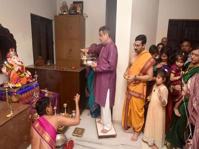 नितीन गडकरी यांच्या निवासस्थानी गणरायाची स्थापना करण्यात आली. गडकरींनी सहकुटुंब गणेशाची पूजा आणि आरती केली.