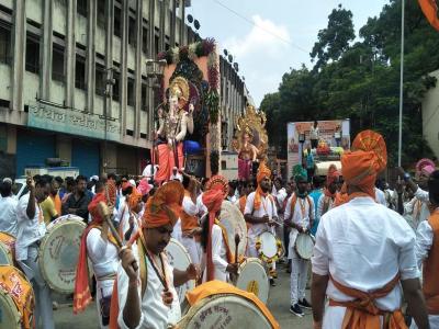गेल्या १० दिवसांपासून मनोभावे सेवा केल्यानंतर रविवारी (23 सप्टेंबर) सकाळपासून नाचत-गाजत बाप्पाच्या मिरवणुकांना सुरुवात झाली आहे. दरम्यान, डीजेवरील बंदीमुळे यंदा ढोल-ताशा आणि बेंजोच्या तालावर गणेशभक्त थिरकताना दिसत आहेत.