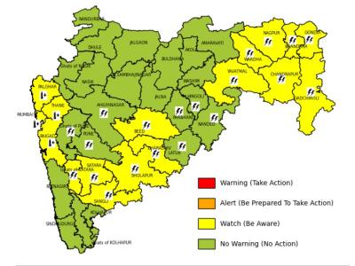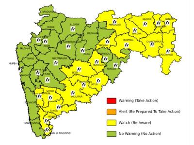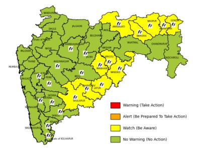 सोमवारी (१६ मार्च) नागपूर, अमरावती, वर्धा, भंडारा, गोंदिया या विदर्भातील जिल्ह्यांसह मराठवाड्यातील आठही जिल्ह्यात तुरळक ठिकाणी वादळी वारे आणि विजांच्या कडकडाटासह पाऊस होण्याचा अंदाज आहे. त्याचबरोबर मध्य आणि पश्चिम महाराष्ट्रातील काही जिल्ह्यातही वादळी पाऊस होण्याची शक्यता वर्तवण्यात आली आहे. यातील काही जिल्ह्यांना यलो अलर्ट देण्यात आला आहे.