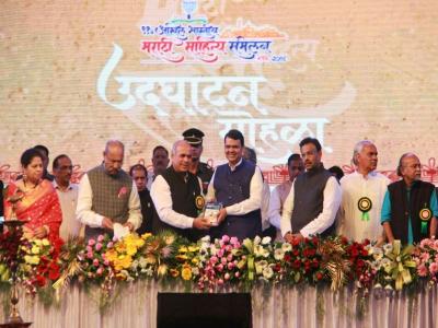 साहित्य संमेलनाचे अध्यक्ष लक्ष्मीकांत देशमुख यांच्यासह मुख्यमंत्री देवेंद्र फडणवीस.