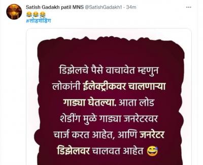 एकीकडे इंधन दरवाढीमुळे इलेक्ट्रीक वाहन खरेदी केली, दुसरीकडे वीजेचा तुटवडा निर्माण झाल्याने आता ही इलेक्ट्रीक स्कुटर चालविण्यासाठी जनरेटर वापरावे लागतंय आणि त्यासाठी डिझेलचा लागतंय, असाही मेसेज फिरत आहे.