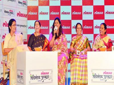 विधिमंडळातील महिला आमदारांच्या कामगिरीवर आयोजित परिसंवादात विद्या चव्हाण मंदाताई म्हात्रे ग्रामविकास मंत्री पंकजा मुंडे निलम गो-हे आणि यशोमती ठाकूर चर्चा करताना.