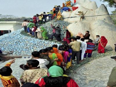इंदोर येथे शंकराच्या मुर्ती समोरील नैवैद्य आणि प्रसादाचा लाभ घेताना भक्त