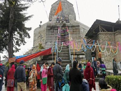 काश्मीर मधील वेगळ्यापद्धतीचे प्रवेशद्वार असलेल्या मंदिरात जाताना भाविक