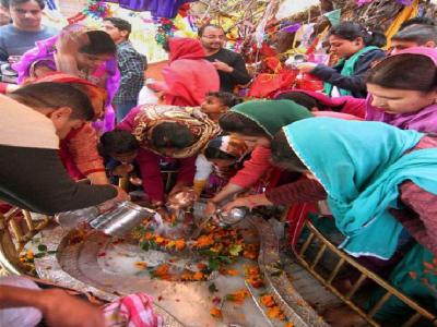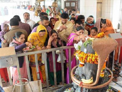 आग्रा येथे शंकराच्या पिंडीला अभिषेक करताना महिला