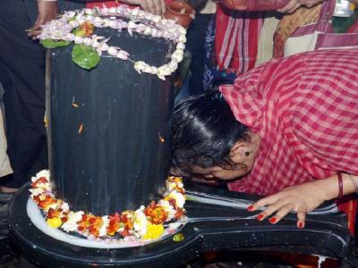 महाशिवरात्री निमित्त कोलकाता येथील मंदिरात शंकराच्या पिंडीला मनोभावे नमस्कार करताना महिला.