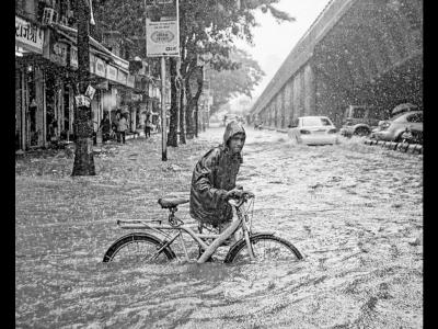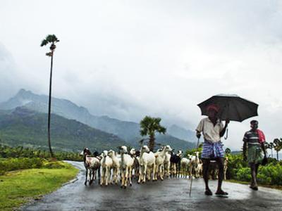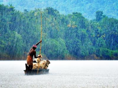 भर पावसात हा व्यक्ती आपल्या बकऱ्यांना एका तटावरुन दुसऱ्या तटावर नेताना..