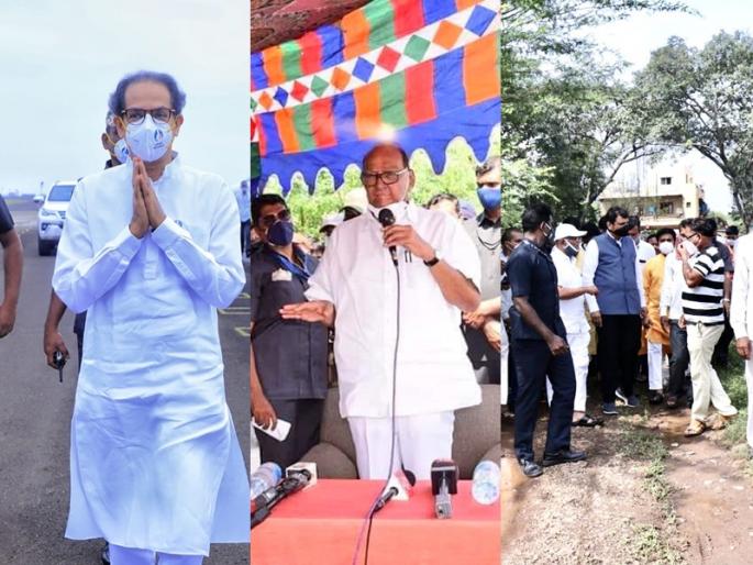 1 / 16राष्ट्रवादीचे सर्वेसर्वा शरद पवार, मुख्यमंत्री उद्धव ठाकरे, खासदार सुप्रिया सुळे आणि विरोधी पक्षनेते देवेंद्र फडणवीस हे पूरग्रस्त भागातील पाहणी करत आहेत. 2 / 16सोलापूर जिल्ह्यात अतिवृष्टीमुळे झालेल्या नुकसान भरपाईची पाहणी करण्यासाठी मुख्यमंत्री पोहचले आहेत, तर बारामतीमधून विरोधी पक्षनेत्यांनी आपला अतिवृष्टी पाहणी दौरा सुरु केलाय. 3 / 16अतिवृष्टीचा फटका बसलेल्या शेतकऱ्यांना राज्य सरकारनं तातडीनं मदत जाहीर करावी. केंद्र सरकार राज्याला सहाय्य करेलच. पण राज्य सरकारनं टोलवाटोलवी न करता आधी मदतीची घोषणा करावी, असं विरोधी पक्षनेते देवेंद्र फडणवीस यांनी म्हटलं आहे. 4 / 16शेतकऱ्यांचं मोठ्या प्रमाणात नुकसान या मुसळधार पावसामुळे झालं असून शेतकऱ्यांकडून राग आणि संताप व्यक्त होत आहे. अद्यापही शेतकऱ्यांच्या शेतात पाणी असून पीकं पाण्याखाली गेल्याचं दिसत आहे. 5 / 16केंद्राची वाट न पाहता राज्य सरकारनं मदत द्यावी. सोयीस्कर भूमिका घेऊ नये. सगळंच केंद्रावर ढकलायचं असेल, तर मग राज्य सरकार कशासाठी आहे, त्यांचं काम काय, असे प्रश्न फडणवीस यांनी उपस्थित केले6 / 16अतिवृष्टीचा फटका बसलेल्या भागांची पाहणी करण्यासाठी बारामतीत आले असताना फडणवीस यांनी पत्रकारांशी संवाद साधला. दुसरीकडे राष्ट्रवादीचे सर्वेसर्वा शरद पवार यांनीही दौऱ्यात शेतकऱ्यांचं मोठं नुकसान झाल्याचं सांगत, शेतकऱ्यांना मदत मिळवून देण्याचं आश्वास दिलंय. 7 / 16भूकंपाप्रमाणेच यंदा अतिवृष्टीने नुकसान झाल्याचं पवार यांनी सांगितलं, तसेच शेतकऱ्यांच्या मदतीसाठी केंद्र सरकारन मदत करावी, अशी मागणीही केली आहे. 8 / 16खासदार सुप्रिया सुळे यांनीही आपल्या मतदारसंघात जाऊन तेथील पूरग्रस्त शेतकऱ्यांच्या नुकसानीची पाहणी केलीय. 9 / 16मुख्यमंत्र्यांच्या सोलापूर दौऱ्याआधीच वाद निर्माण झाला होता, सांगवी खुर्दच्या ग्रामस्थांना मुख्यमंत्र्यांच्या भेटीसाठी बोरी नदीच्या पुलावर या असे सांगितले गेले, पण, पुलावरुन नुकसान भरपाईची पाहणी करणार कसं? असा सवाल गावकऱ्यांनी उपस्थित करत मुख्यमंत्री गावात आले तर ठीक, नाहीतर आम्ही त्यांच्याकडे जाणार नाही अशी भूमिका गावकऱ्यांनी घेतली होती. 10 / 16सुरक्षेचे कारण देत प्रशासनाने गावकऱ्यांची समजूत काढली त्यानंतर काही गावकऱ्यांना रस्त्यावर बोलवण्यात आले, या लोकांशी मुख्यमंत्री उद्धव ठाकरेंनी संवाद साधला.11 / 16सांगवी खुर्दच्या ग्रामस्थांनी मुख्यमंत्री उद्धव ठाकरेंशी संवाद साधला, यावेळी तुम्ही एकटे नाही, सरकार तुमच्या पाठिशी आहे अशा शब्दात मुख्यमंत्री उद्धव ठाकरेंना ग्रामस्थांना दिलासा दिला आहे12 / 16मी तुम्हाला दिलासा द्यायला आलो आहे, तुम्ही एकटे नाही, कोणीही वाऱ्यावर पडलं नाही, आपलं सरक