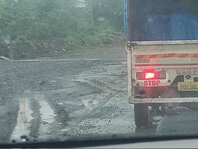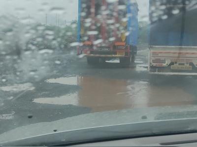 पहिल्याच पावसानंतर राष्ट्रीय महामार्ग विभागाकडून देखभाल करण्यात येणाऱ्या सर्व्हिस रोडची अवस्था किती वाईट झाली आहे हे उघड झाले आहे. (Photo Credit: X/@carvesone)