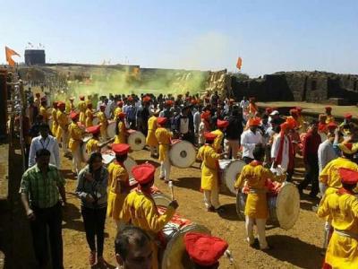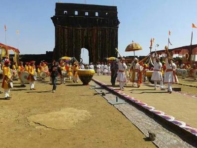 छत्रपतींच्या काळातील पारंपरिक टाळनृत्य दांडपट्टा कसरतीचे मर्दानी खेळ ढोल-ताशे यांनी उपस्थितांना शिवकाळाची झलक दाखविली.