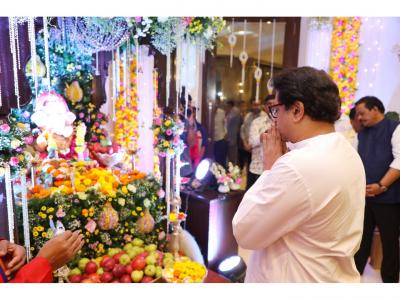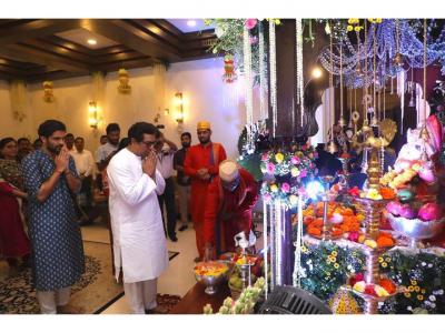 वर्षा बंगल्यावर गणपती बाप्पासाठी अतिशय सुंदर आरास करण्यात आली आहे. या बाप्पाच्या दर्शनासाठी राज संध्याकाळच्या सुमारास वर्षा बंगल्यावर दाखल झाले होते.