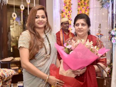 राज ठाकरे यांच्या पत्नी शर्मिला ठाकरे यांचे स्वागत श्रीकांत शिंदे यांच्या पत्नी वृशाली शिंदे यांनी पुष्पगुच्छ देऊन केले.