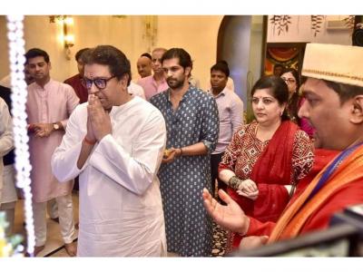 मुख्यमंत्री शिंदे यांच्या निवासस्थानी राज ठाकरे यांनी मनोभावे हात जोडून गणपती बाप्पाचे दर्शन घेतले.