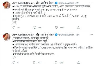 आशिष शेलारांनी ट्विटमध्ये म्हटलंय की, राज्यसभा निवडणुकीत काँग्रेसनं शिवसेनेला मदत केली नाही. भाजपाकडे ११३ मतांचा कोटा असताना १२३ मते कशी व कुठून आली? शिवसेनेच्या प्रथम पसंतीचे उमेदवार संजय राऊत यांच्यापेक्षा धनंजय महाडीक यांना मते जास्त पडली
