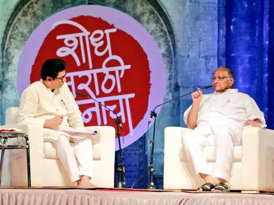 जागतिक मराठी अकादमी आणि बीव्हीजी ग्रुप आयोजित ‘शोध मराठी मनाचा’ या कार्यक्रमात महाराष्ट्र नवनिर्माण सेनेचे अध्यक्ष राज ठाकरे यांनी शरद पवारांची प्रकट मुलाखत घेतली.
