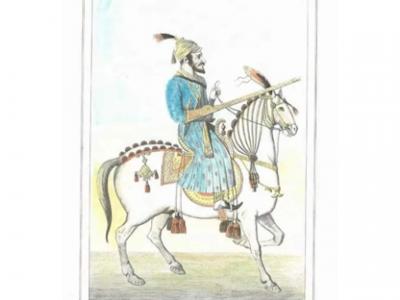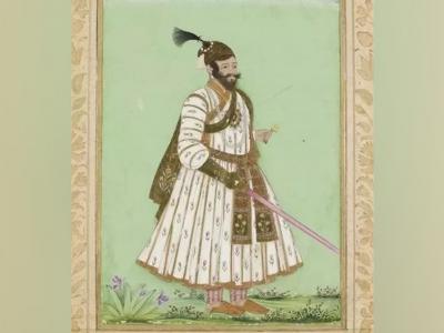 साधारणपणे १८ व्या शतकात काढलेलं हे चित्र, बडोदा संस्थानच्या संग्रहालयात आहे. त्यात एका हातात फूल तर डाव्या हातात पट्टा अन् कमरेला ढाल आहे.