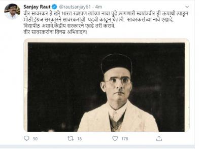वीर सावरकर हे खरे भारत रत्न!पण त्यांच्या नावा पुढे लागणारी स्वातंत्रवीर ही ऊपाधी त्याहून मोठी. इंग्रज सरकारने सावरकरांची पदवी काढून घेतली. सावरकरांच्या नावे एखादे. विद्यापीठ असावे.केंद्रीय सरकारने एवढे तरी करावे. वीर सावरकरांना विनम्र अभिवादन!, असे राऊत यांनी म्हटले आहे.