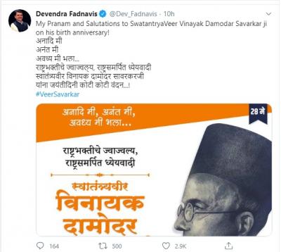 देवेंद्र फडणवीस यांनीही सावरकर यांना जयंतीनिमित्त आदरांजली वाहिली