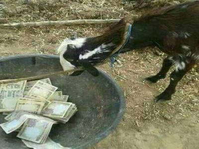 500/1000 रुपयांच्या नोटा बकरीला चरण्यासाठी देण्यात आल्याचा फोटो सोशल मीडियावर प्रचंड प्रमाणात शेअर करण्यात आला आहे. काहींनी तर सोबत आता या नोटा बकरीदेखील चरणार नाही असे म्हणत खिल्ली उडवली आहे.