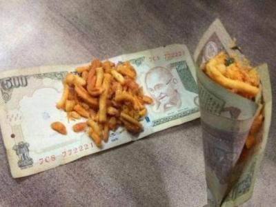 आता 5001000 रुपयांच्या नोटांचा काही उपयोग नसल्याने या नोटांमधून आता फरसाण वगैरे खाल्ले जात असल्याचा फोटोही व्हायरल झाला आहे.