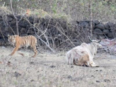 टिपेश्वर अभयारण्याच्या सीमेवर वसलेल्या सुन्ना गावात चार बछड्यांसोबत आलेली ही वाघीण एका शेतात शिरली आणि तिनं बैलावर झडप घातली. या हल्ल्यात बैल ठार झाला.