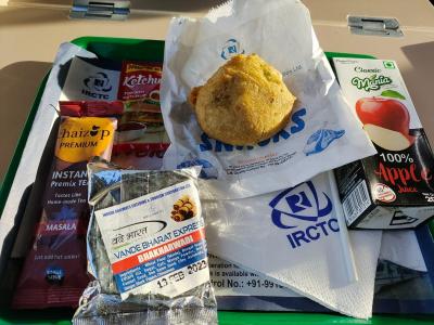 क्समध्ये सफरचंदाचा प्रीझर्व्हड ज्यूस, बाकरवडी (चितळेंची नाही) त्यावरीलही एक्स्पायरी डेट खोडलेली. गरम पाण्यात मिसळून पिण्यासाठी चहा पावडर, एक बटाटा वडा(पाव नाही) असे देण्यात आले होते. यामध्ये सफरचंदाचा रस काहीसा क़डवट लागत होता. ही कंपनीही सो सोच होती. बाकरवडीचीही क्वालिटी एवढी खास नव्हती. दुसऱ्या एका प्रवाशाला बाकरवडीऐवजी वेगळा आयटम देण्यात आला होता.