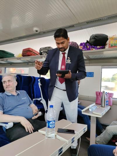 ही प्रिमिअम ट्रेन असल्याने त्याचा प्रवासी वर्ग देखील बराचसा श्रीमंत, इंग्रजी- हिंदी झाडणारा असेल असे रेल्वेला अपेक्षित असावे. यामुळे बहुतेक टीसी इंगजी, हिंदी बोलणारा परंतू मराठी होता. महत्वाचे म्हणजे तो राष्ट्रीय स्तरावर व्हॉलिबॉल खेळलेला खेळाडू, कॅप्टन होता. इतर पँट्रीचे कर्मचारी मात्र नेहमीच्या ट्रेनमध्ये असतात तसेच होते.