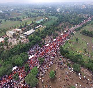ऑनलाइन लोकमतनाशिक, दि. २४ - कोपर्डी येथील बलात्काराच्या घटनेचा निषेध नोंदवितानाच अन्य मागण्यांसाठी आयोजित मराठा क्रांती मोर्चास तपोवन येथून प्रारंभ झाला आहे. महिला आणि तरुणींचा लक्षणीय सहभाग असलेल्या या मोर्चासाठी जिल्ह्यातून लाखो मराठा नागरीक एकवटले असून या मराठा महासागराने कुंभ मेळ्यातील गर्दीच्या नाशिककरांच्या आठवणी जाग्या करून दिल्या आहेत. मोर्चाच्या प्रारंभी सुसज्जित वाहनावर शिव प्रभूंचा पुतळा त्या पाठीमागे अश्वारूढ शिवराय असून शिवबा व जिजाऊंच्या वेशभूषेत मुले आणि मुली आहेत. लाखोंच्या संख्येने जनसागर लोटला असून विविध राजकीय पक्षांचे नेते, शहराध्यक्ष , आमदार आदी सामान्य कार्यकर्त्याच्या भूमिकेतून कार्य करताना दिसत आहेत. तपोवन येथे शिव प्रभूंना वंदन करून मोर्चा मार्गस्थ झाला असला तरी औरंगाबाद महा मार्गावर विंचुर, धुळे मार्गावर ओझर , चांदवड, सापुतारा मार्गावर दिंडोरी , पुणे महा मार्गावर शिंदे - पळसे तर मुंबई महा मार्गावर घोटी पर्यंत वाहतूक खोळंबली असून हजारो मोर्चेकरी रस्त्यात अडकून पडले आहेत. त्र्यंबकेश्वर येथील आधार तीर्थ मधील आत्महत्या केलेल्या शेतकऱ्यांची मुले, शाळकरी विद्यार्थी, वकील, डॉक्टर्स अभियंते, साहित्यिक असे समाजातील सर्व घटक मोर्चात सहभागी झाले आहेत. राजकीय नेत्यांऐवजी कार्यकर्त्यांनी मोर्चाची सूत्रे हाती घेतली असून हा मोर्चा पंचवटी , रविवार कारंजा, एम जी रोड सीबीएस मार्गे हुतात्मा अनंत कान्हेरे मैदानावर पोहोचणार असून तेथे मराठा पंचकन्या निवेदनचे वाचन करून ते जिल्हाधिकाऱ्यांना देतील. मोर्चाचा संपूर्ण मार्ग मराठा बांधवांनी ओसंडून वाहत असून संपूर्ण शहर भगवेमय होत गर्दीने फुलून गेले आहे. दरम्यान महाराष्ट्रातील आत्महत्याग्रस्त शेतकऱ्यांची मुले मोर्चात सहभागी झाली असून त्या मुलांनी कोपर्डी घटनेचा निषेध म्हणून टक्कल केले आहे.