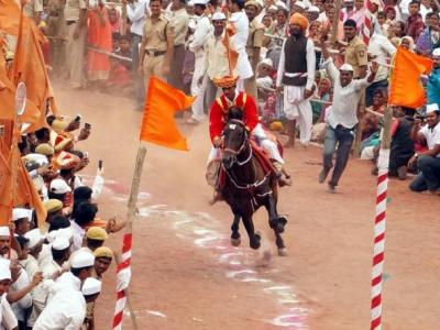 लाल मातीची धूळ उडवीत वार्याला मागे सोडून वेगात धावणारे कृष्णवर्णीय अश्व ... त्याच्या टापाखालील माती उचलून मनोभावे कपाळाला लावणारे भाविक.. असे दृश्य तुकाराम महाराजांच्या पालखी सोहळ्याचे दुसरे गोल रिंगण पार पडताना दिसत होते.