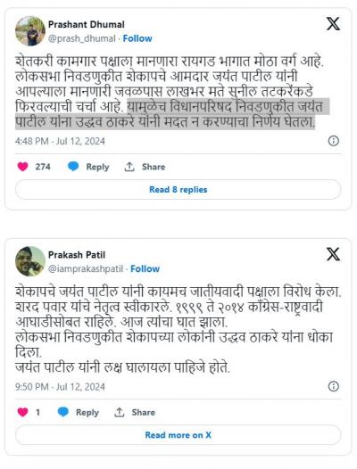 लोकसभेला शिवसेनेला मदत केली नाही म्हणून उद्धव ठाकरेंनी आपला उमेदवार देत जयंत पाटलांना मदत न करण्याचा निर्णय घेतला असेल, असे मत सोशल मीडियावर व्यक्त होत आहे. शेकापचे जयंत पाटील आज विधानपरिषदेत पडले त्यामागे रायगडचा सुनील तटकरेंचा विजय जबाबदार आहे हे उघड गुपित आहे, असेही काही जणांनी म्हटले आहे.