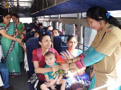 ठाणे एसटी स्थानकात जागतिक महिला दिनानिमित्त एसटीच्या वाहक महिलांनी प्रवाशी महिलांना फुलं देऊन महिला दिनाच्या शुभेच्छा दिल्या. (छाया - विशाल हळदे)