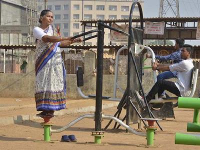 महिला दिनानिमित्त ज्येष्ठ नागरिक प्रतिक्षा नगरमधील ओपन जिममध्ये व्यायाम करुन आपला महिला दिन साजरा करत आहेत. (छाया - सुशील कदम)