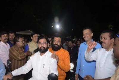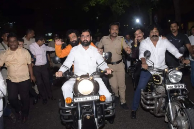 PHOTOS: 'धर्मवीर' आनंद दिघेंचे पुन्हा एकदा सारथी झाले एकनाथ शिंदे; ग्रँड प्रिमियरला बुलेटवरुन कडक एन्ट्री!