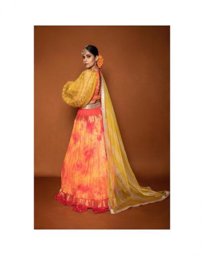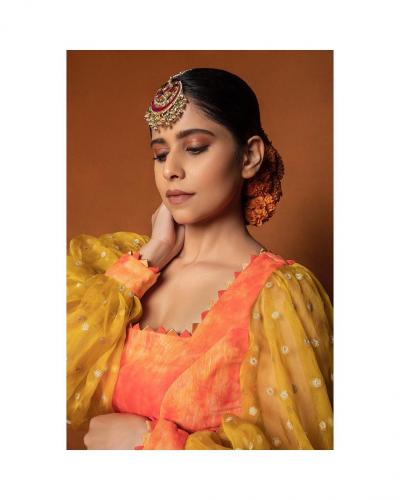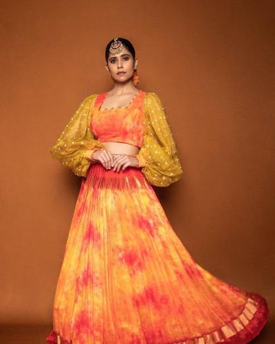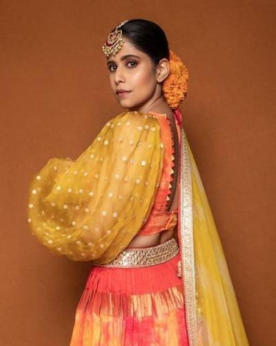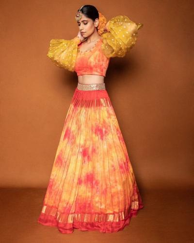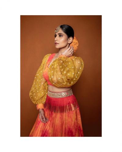 सई ताम्हणकरच्या ऑरेंज लेहंग्यातील चोळीच्या पफ हातामुळे छान गेटअप आले आहे.