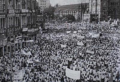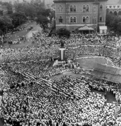 पण त्याला छेद देत पांढरपेशांचा प्रचंड जनसमुदाय, एका बाजूने चर्चगेट स्थानकाकडून व दुसऱ्या बाजूने बोरीबंदरकडून उत्तुंग घोषणा देत, फ्लोरा फाउंटनकडे गोळा होऊ लागला. हा मोर्चा पोलिसी ताकद वापरून उधळला जाईल, असा अंदाज होताच. कारण फोर्ट भागात जमाव आणि सभाबंदी जारी केली गेली होती.