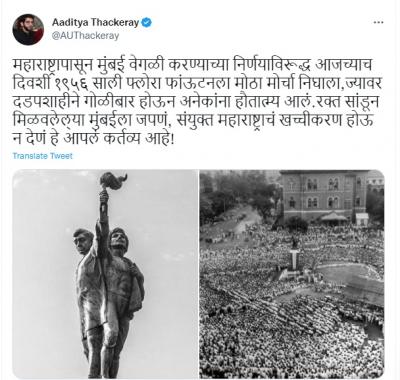 आदित्य यांनी फ्लोरा माऊंटन येथे जमलेल्या गर्दीचा आणि हुतात्मा चौकातील हुतात्मा स्मारकाचा फोटो शेअर करत संयुक्त महाराष्ट्राच्या चळवळीचा आठवण करुन दिली आहे. सध्या महाराष्ट्रापासून मुंबई वेगळा करण्याचा डाव घातल्याचा आरोप शिवसेनेकडून सातत्याने होतो.