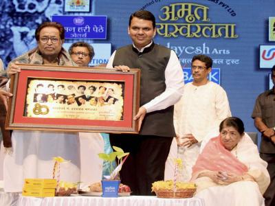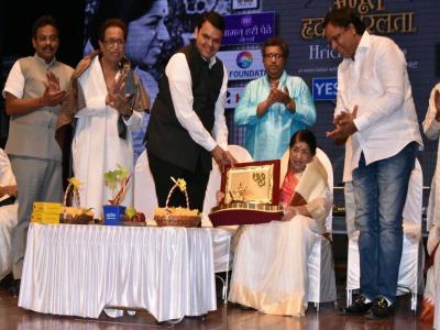 मुख्यमंत्री देवेंद्र फडणवीस यांच्या हस्ते लता मंगेशकर व पं. हृदयनाथ यांचा खास सन्मान करण्यात आला.