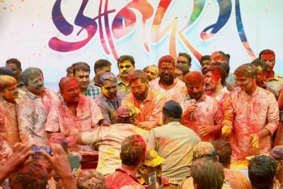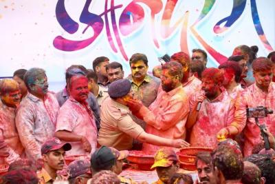 एकनाथ शिंदे यांनी पोलीस कर्मचारी, सुरक्षा रक्षक आणि इतर सहकाऱ्यांसोबतची रंगपंचमी साजरी केली.