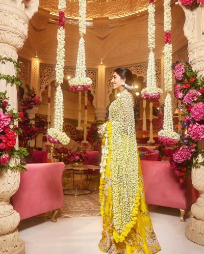 हळदीसाठी खास लूक केलेल्या राधिकाने खऱ्या फुलांची झालर असलेली ओढणी घेतली होती. मोगऱ्याच्या फुलांनी विणलेल्या या फ्लॉवर ओढणीने तिच्या सौंदर्यात भर पडली होती.