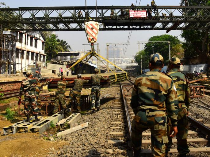 1 / 5लष्करामार्फत आंबिवली, एल्फिन्स्टन-परळ पादचारी पूल उभारणीचे काम पूर्ण झाल्यानंतर, रविवारी करी रोड येथेही लष्कराने यशस्वीपणे पूल उभारला. 2 / 5११ टप्प्यांमध्ये करी रोड येथील पूल उभारणीचे काम पूर्ण करण्यात आले. 3 / 5करी रोड येथील मोठ्या प्रमाणातील लोकल-एक्स्प्रेस यांची वाहतूक, मर्यादित जागा आणि वेळ, पुलाच्या बांधकामांचे साहित्य आणि मशिनरी यांची व्यवस्था अशी विविध आव्हाने या ठिकाणी होती. 4 / 5मात्र, लष्कराने सुनियोजन, पूर्वतयारी यांच्या मदतीने आव्हाने पार केली. यासाठी लष्कराने आधुनिक पद्धतीने पुलाची बांधणी केली. तिन्ही ठिकाणी ३५० टन वजनी क्षमता असलेल्या क्रेनचा वापर करण्यात आला. 5 / 5सध्या पूल उभारणीचे काम पूर्ण झाले आहे. केवळ पायºया आणि छताचे काम बाकी आहे. १० ते १५ दिवसांत करी रोड लष्करी पादचारी पुलाच्या पायºयांचे आणि छताचे काम पूर्ण करण्यात येईल.