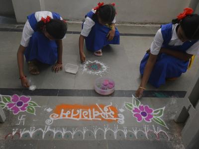 विद्यार्थिनींनी रांगोळी काढून शाळेतील वर्गात प्रवेश केला.