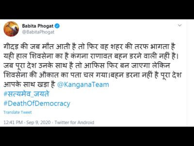 पालिकेच्या कारवाईनंतर भाजपात प्रवेश केलेल्या बबितानं जोरदार टीका केली. तिनं लिहिलं की,''मृत्यू जवळ आला की गिधाड शहराकडे धाव घेतो, शिवसेनेची तशीच अवस्था आहे. कंगना राणौत यांना घाबरणारी नाही. संपूर्ण देश तिच्या पाठीशी आहे. ऑफिस पुन्हा बनवलं जाईल, परंतु शिवसेनेची औकात सर्वांना माहीत पडली. कंगना तू घाबरू नकोस, संपूर्ण देश तुझ्यासोबत उभा आहे.''