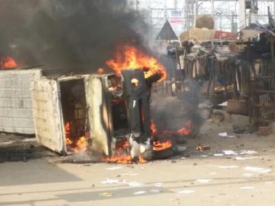 अज्ञात व्यक्तींनी पोलिसांच्या गाडीलाच आग लावल्याने परिस्थिती तणावपूर्ण बनली. पोलिसांनी जमावाला पांगवण्यासाठी सौम्य लाठीमारही केला.