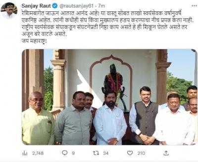 शिंदेंनी शिवसेनेसोबत केलेल्या बंडखोरीवरुन संजय राऊत यांनी भाजप आणि संघा परिवारातील स्वयंसेवकाचे उदाहरण दिले. राष्ट्रीय स्वयंसेवक संघाकडून संघटनेप्रती निष्ठा काय असते हे ही शिकून घेतले असते तर अजून बरे वाटले असते. जय महाराष्ट्र!, असेही राऊत यांनी म्हटले.